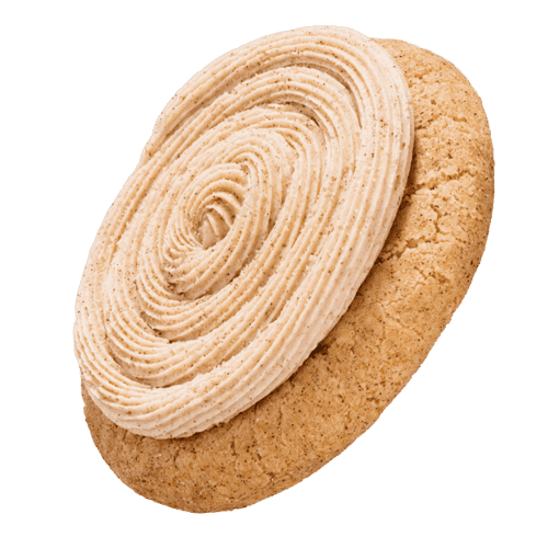 A warm cinnamon cookie topped with a swirl of smooth cinnamon buttercream and a dusting of cinnamon sugar.